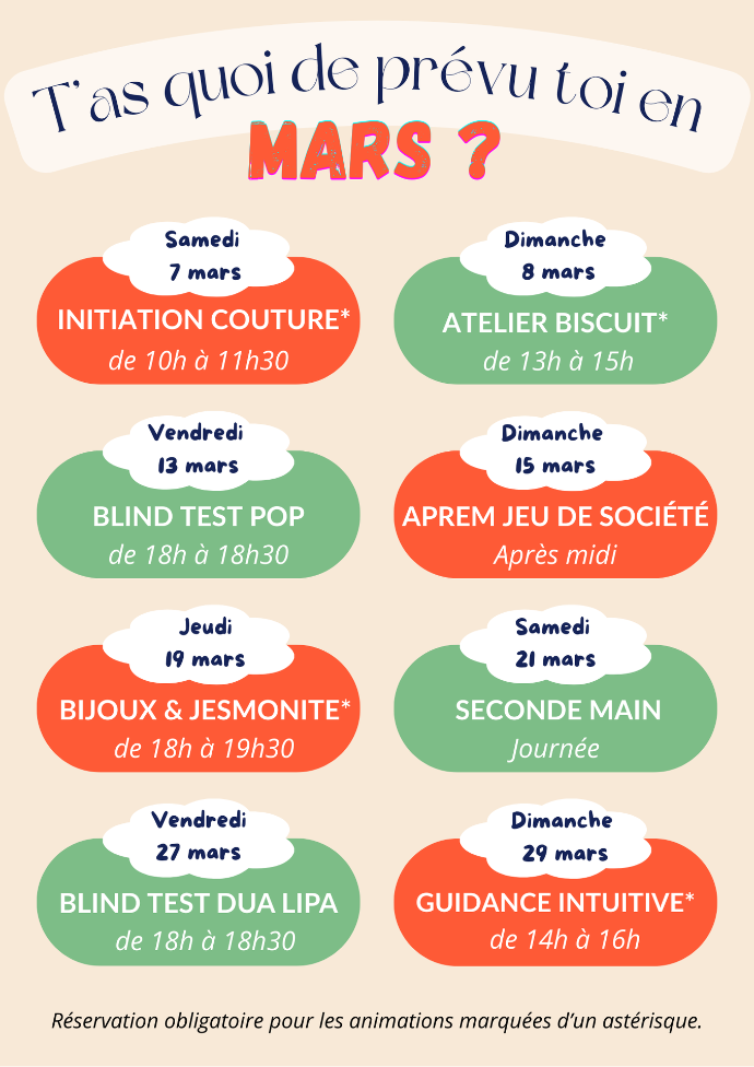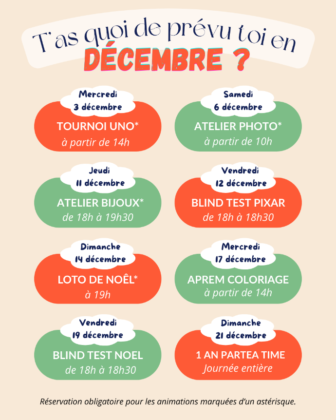 Entre karaokés endiablés, blind tests musicaux, soirées jeux, dégustations de thé, ateliers créatifs et événements inédits comme nos journées tattoo, chaque rendez-vous promet rires, découvertes et convivialité.